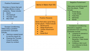 Mario Kart Wii is an ideal example when comparing how operant conditioning works. The game allows the player to learn the mechanics and items of the game through the use of these techniques. When coupled with classical conditioning, players further understand the benefits of their actions. The item box itself encompasses all instances of operant conditioning through its contents. The item box always provides positive rewards by providing you with a good item (unless you self inflict the item on yourself such as those pesky bananas). Items within the box provide positive punishments. The POW box provides an obstacle where players need to jump. In this example speed is something good the player needs but the POW box takes away any items the player has. Failure to jump means a negative punishment impacts the player. Further providing more negative punishment and greater incentive to dodge.